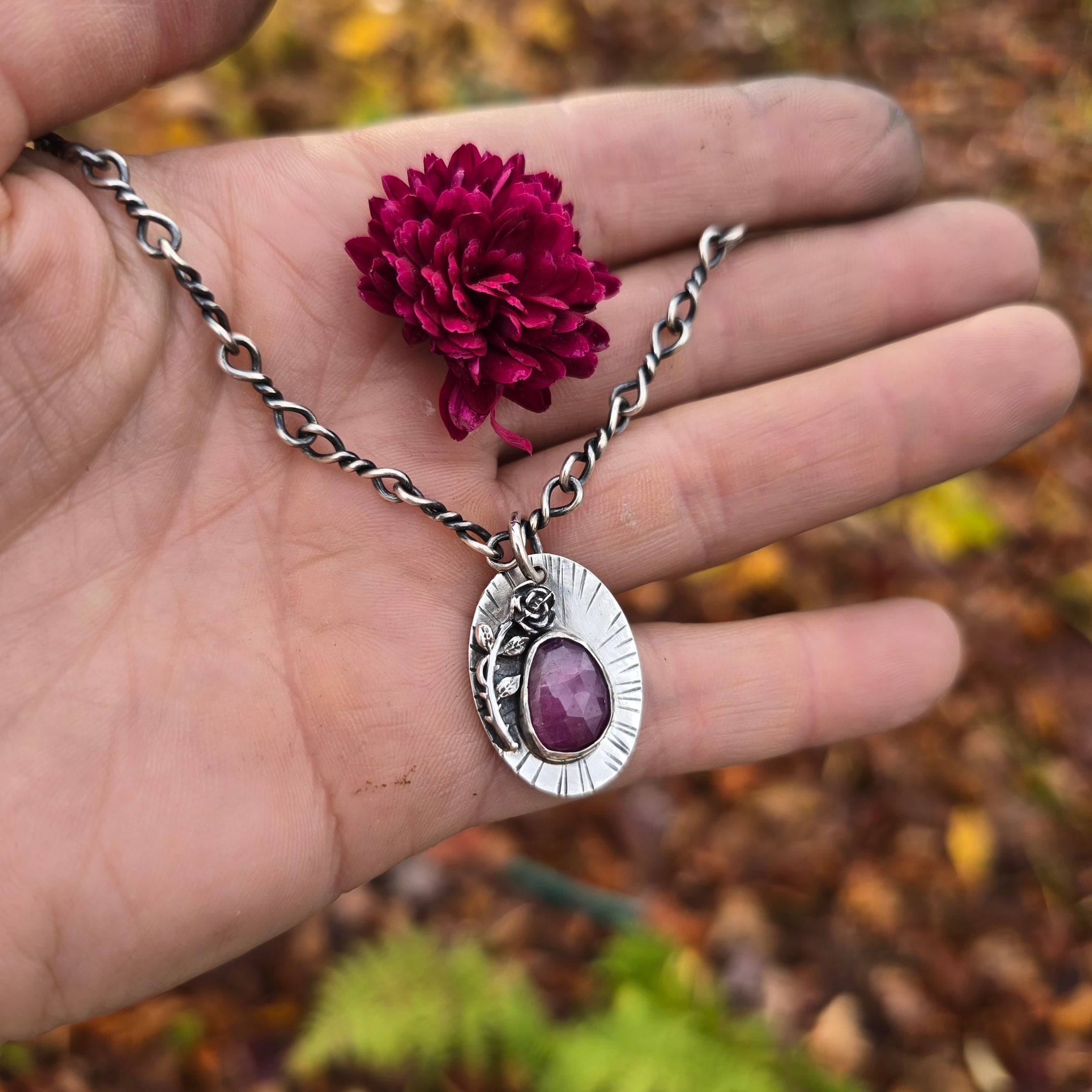 This series features four one-of-a-kind designs, each paired with a natural gemstone and a form drawn from the wild: hummingbird, dragonfly, or rose — solid silver and set with ruby or peridot. Every pendant measures 1.25 inches, balanced in weight and proportion, with texture and polish that reflect the rhythm of the maker’s hand.