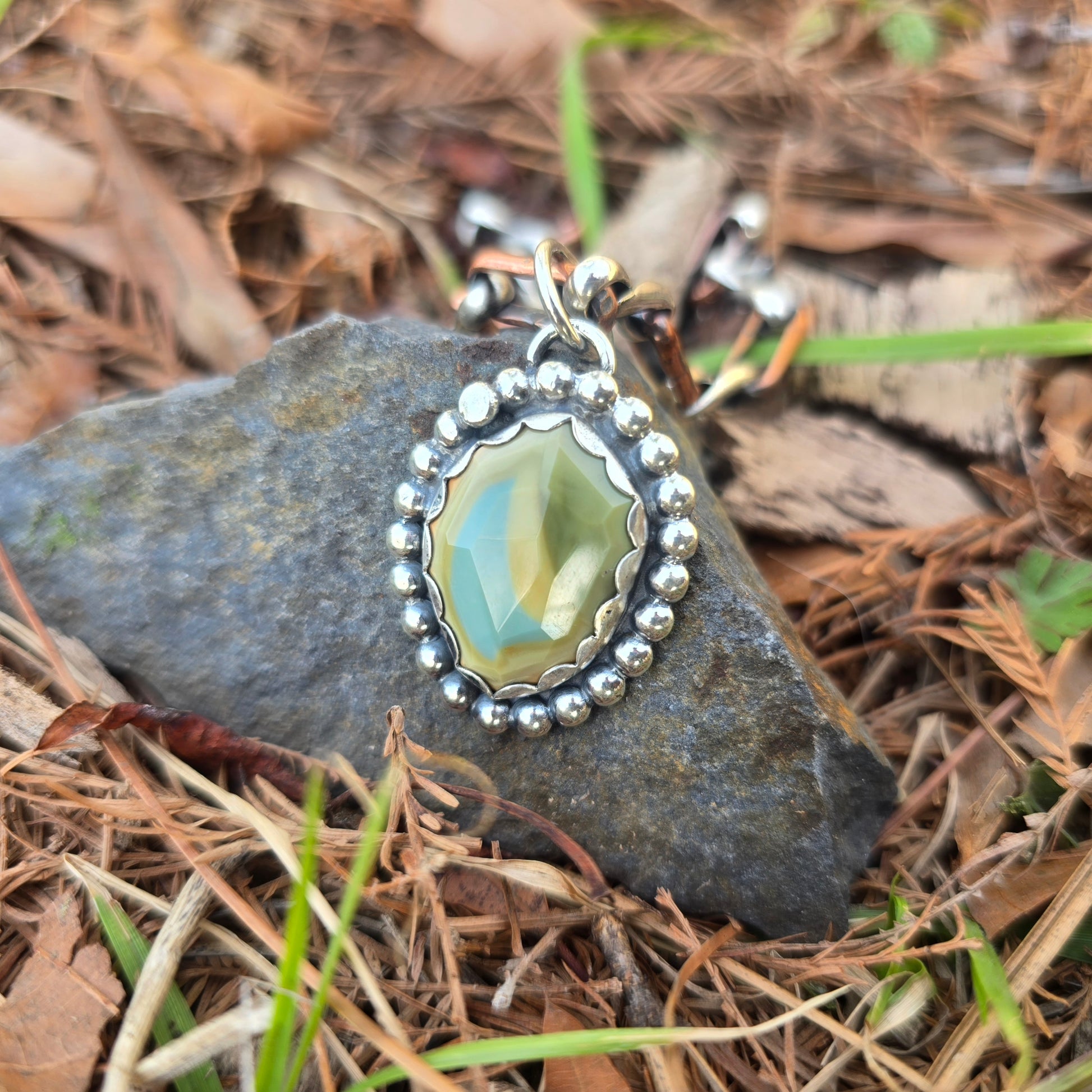 Hand-forged in our Adirondack jewelry studio, this one-of-a-kind silver jewelry piece features a faceted freeform green imperial jasper framed by a bold bead perimeter. Built in sterling silver with a scalloped bezel and single bead accent, the composition carries grounded presence and measured structure. This pendant is a singular studio release.