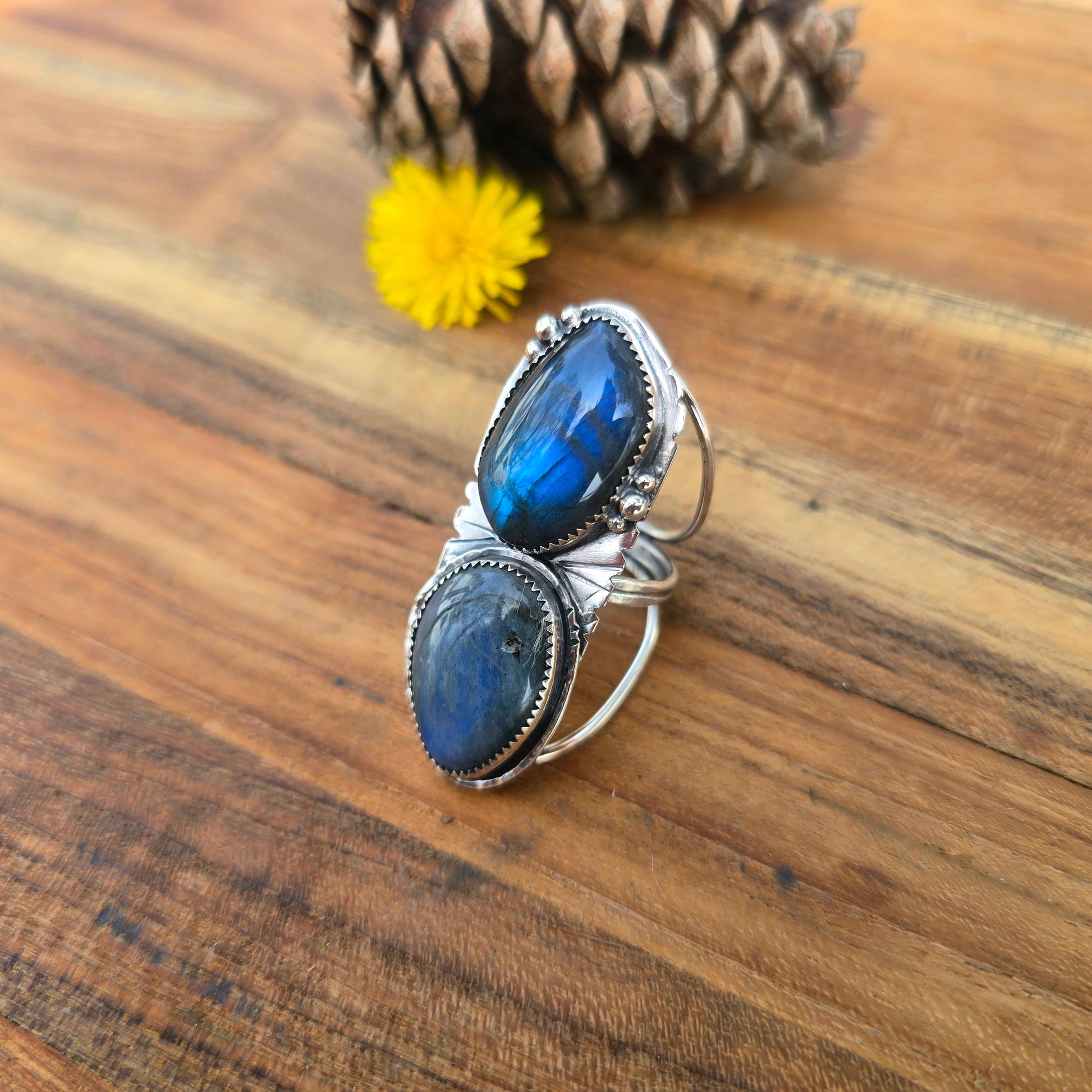 Forged by hand in solid sterling silver, this one-of-a-kind statement ring is built in our Adirondack jewelry studio using traditional silversmithing tools and disciplined bench work. Two blue flash labradorite cabochons — one raindrop-shaped and one freeform — are stacked in a strong vertical composition and secured in serrated bezels.