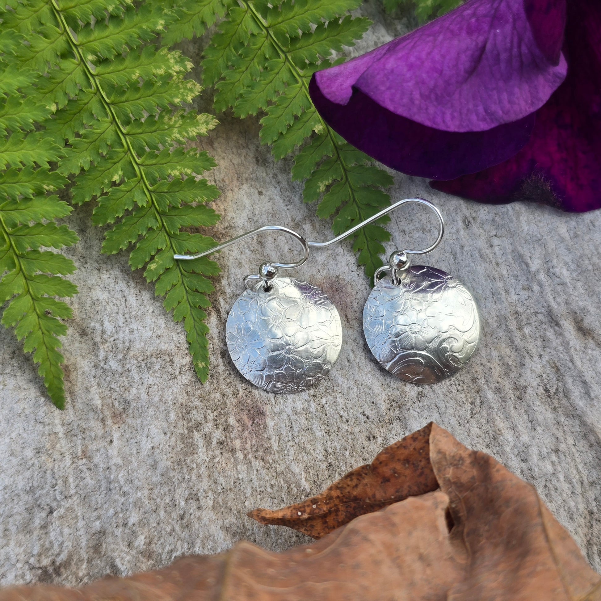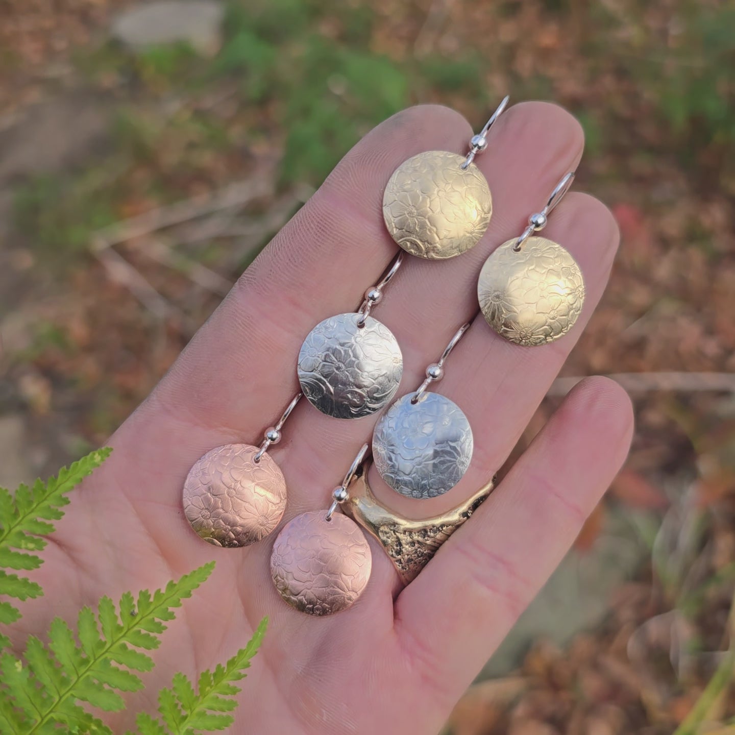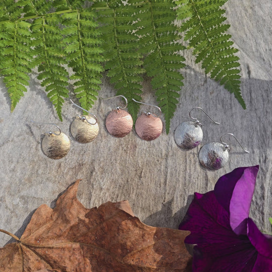 These dangle earrings measure approximately 1.25 inches in length. The dangle element is available in sterling silver, brass, or copper. Each pair is finished with sterling silver French wires. Metal selection applies to the dangle component only.