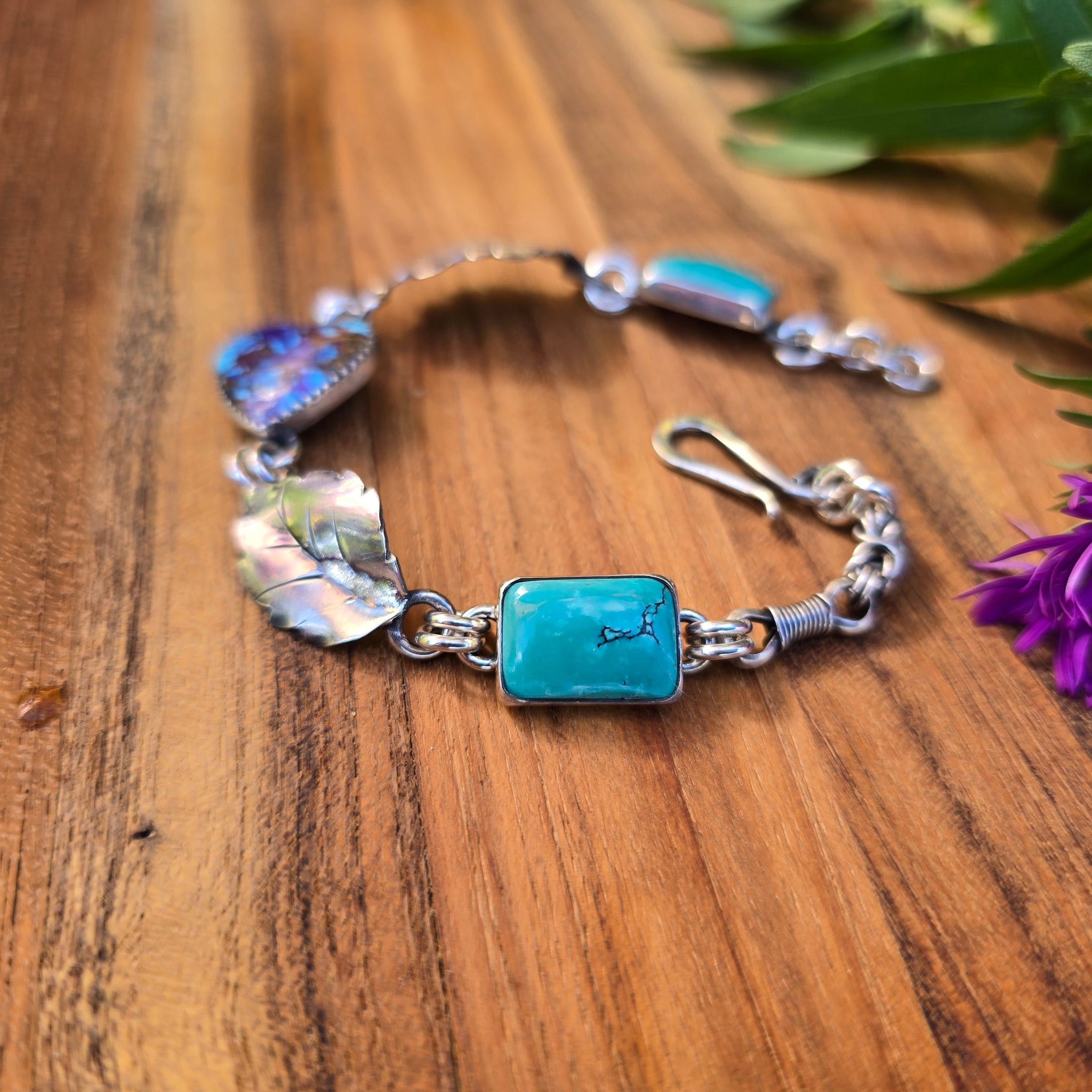 Born from the hands of our collectors’ choice, this Journey Bracelet brings together forged silver and vibrant stone in perfect harmony. Two radiant rectangles of turquoise echo the tones of open sky and river stone, joined by two sterling silver leaves and centered around a striking purple Mohave turquoise heart. A sterling silver bowtie link ties the design together — balanced, tactile, and built for movement.