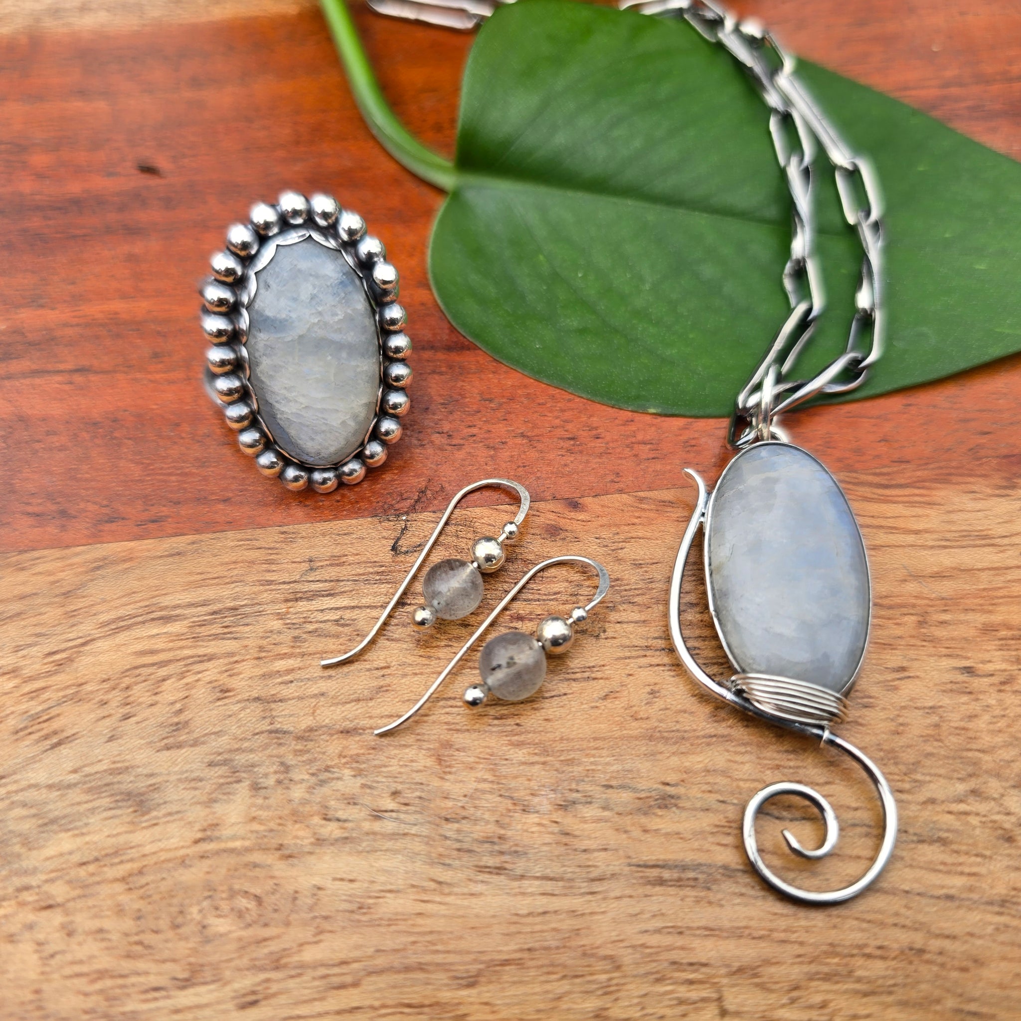 A luminous Rainbow Moonstone Collection featuring a hand-forged windswept-inspired pendant measuring 2.25 inches, paired with a separately collected 19-inch sterling silver chain. The set also includes a size 6.5 ring framed by a bold beaded perimeter that enhances the moonstone’s shifting light, along with a pair of delicate threader earrings measuring approximately 1 inch. Each piece is shaped individually in our Adirondack foothills studio, celebrating the natural iridescence of rainbow moonstone through intentional design, refined texture, and sculptural form.