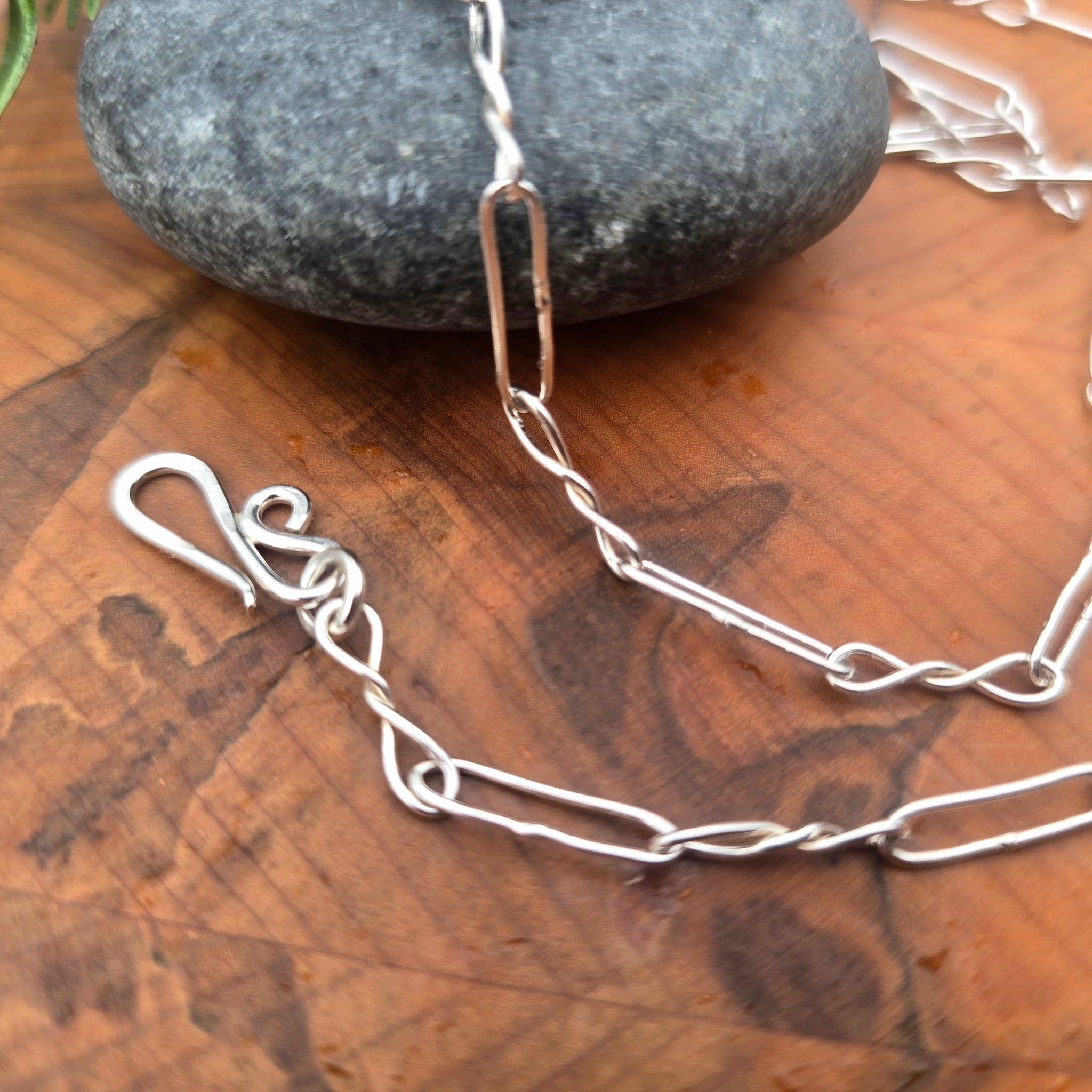 This chain is constructed in sterling silver using a combination of 20-gauge twisted links and paperclip-style links. The shiny surface finish highlights the contrast between the two link profiles. The chain carries a light, balanced feel at the neckline. The structure remains consistent throughout. Each bracelet chain is built to order to the selected length, with slight variation occurring naturally.