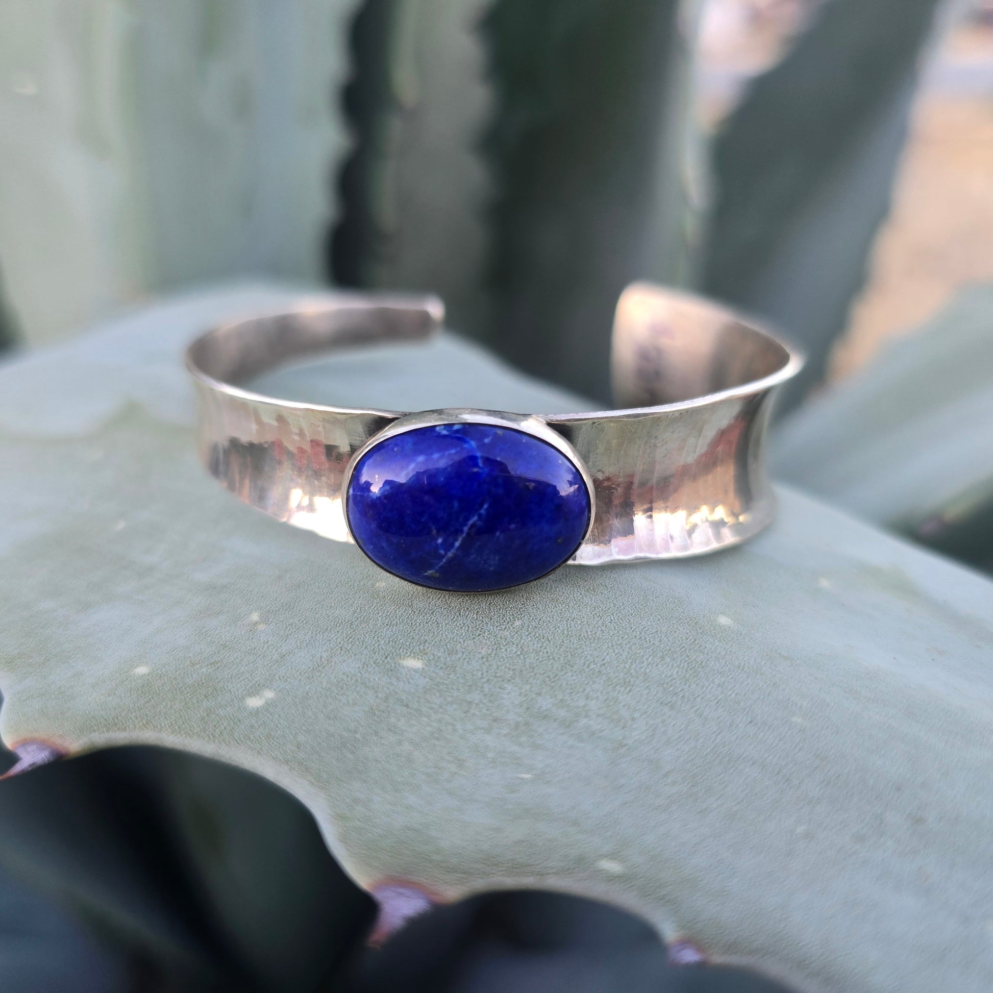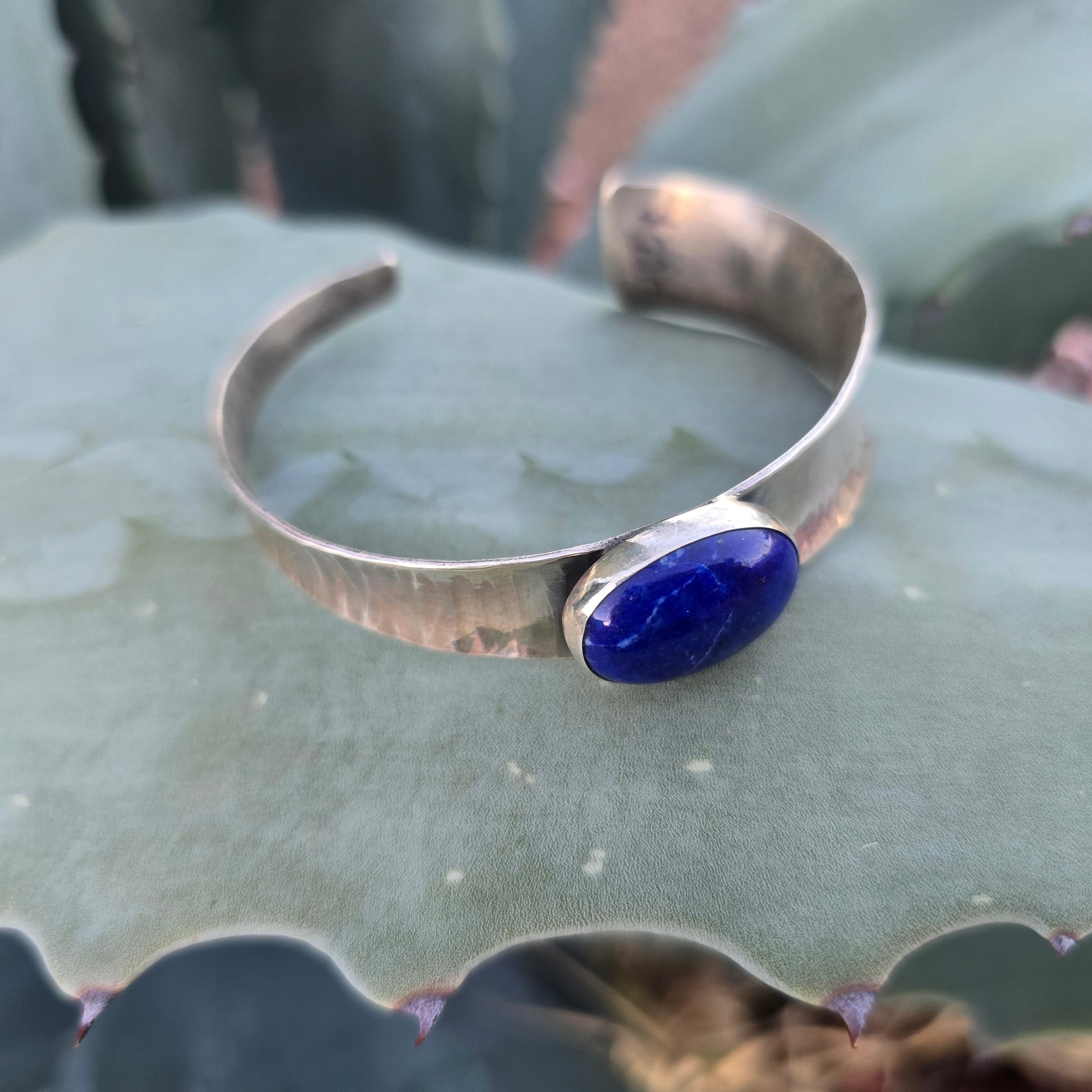 This cuff is structured around a single lapis lazuli stone, positioned within an asymmetrical sterling form that shifts visual weight intentionally across the wrist. The balance was determined at the bench to maintain stability while allowing negative space to define the silhouette. Medium to substantial in presence, the cuff holds its shape while remaining wearable for extended periods. The open design accommodates a wrist circumference of approximately 6.5 to 7 inches.