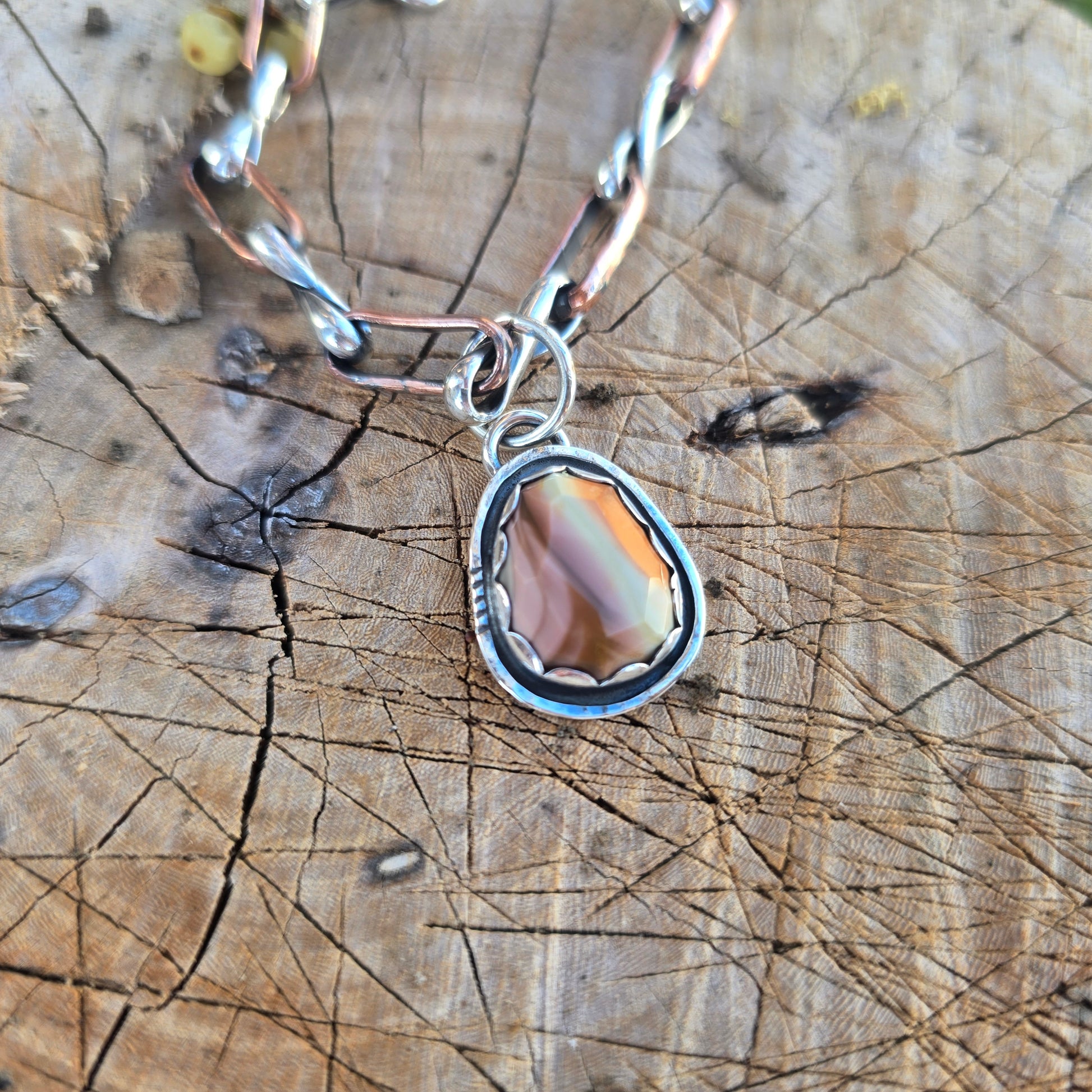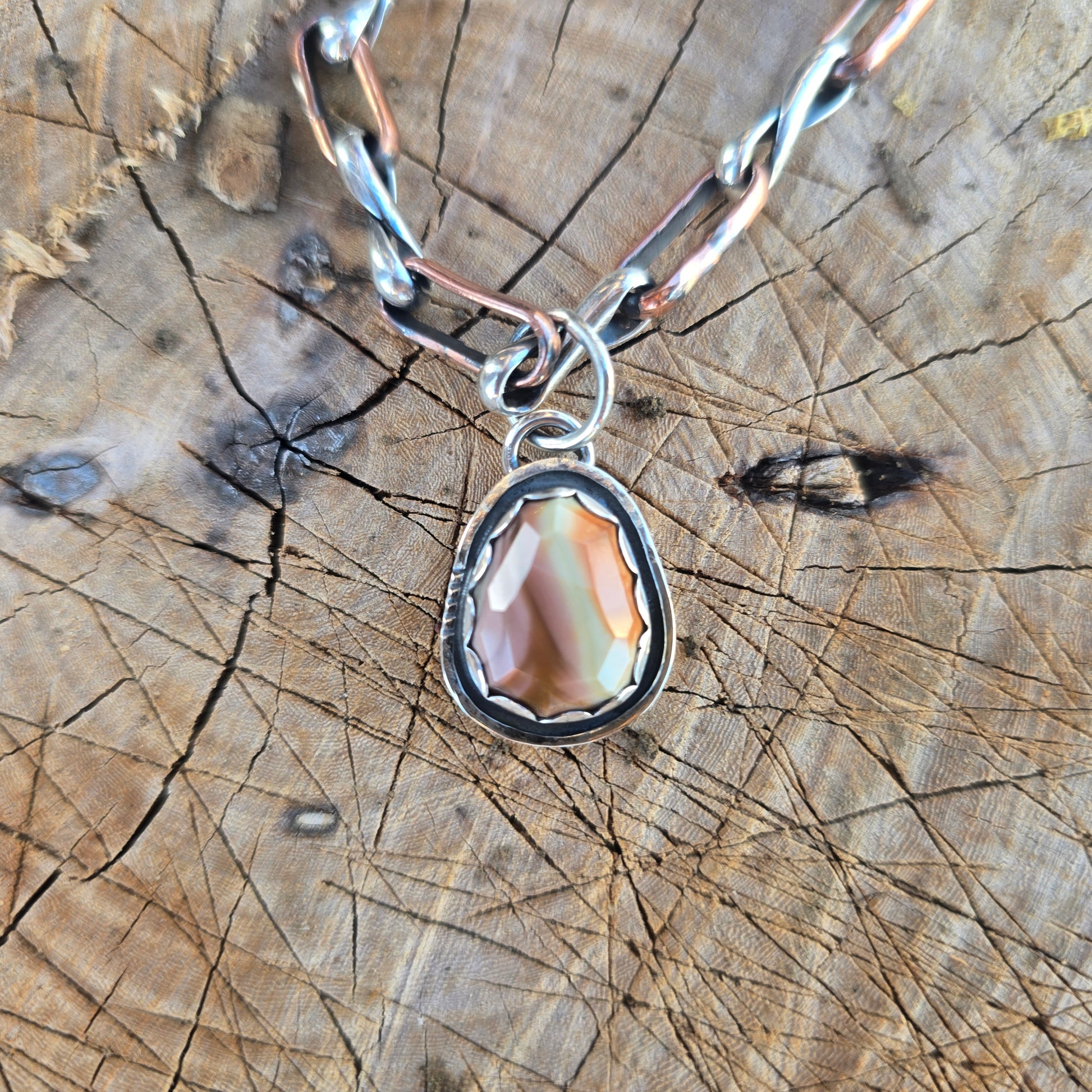 This pendant features a single imperial jasper stone marked by earthy browns and oranges with natural tonal variation. A decorative sterling perimeter frames the stone, providing defined structure without excess bulk. The surface has been oxidized to introduce depth and contrast, sharpening the edge detail and reinforcing the stone’s coloration. Measuring approximately 1.25 inches in length, the pendant carries a compact yet substantial presence suited for daily or layered wear.