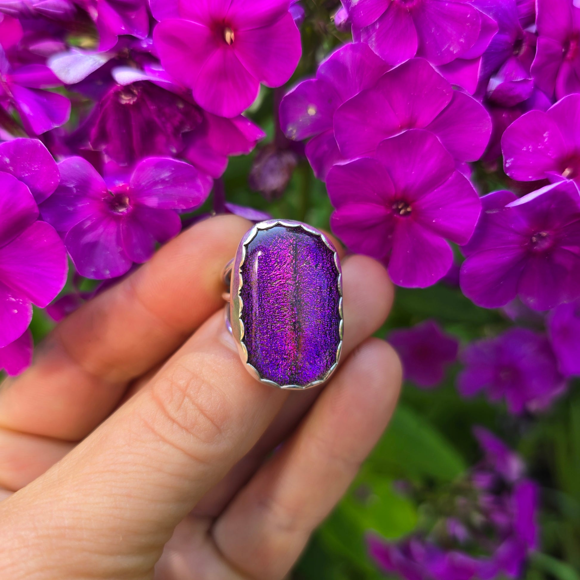 This ring is centered on a single pink and orange dichroic element, selected for its layered color shift and surface reflectivity. A scalloped bezel frames the stone with defined structure, while the triple shank construction distributes weight evenly across the finger and reinforces stability. The silver is finished to a bright polish, sharpening the bezel edge and maintaining clarity of line. Built as a size 5, the ring may be sized up to 6.5 upon request.