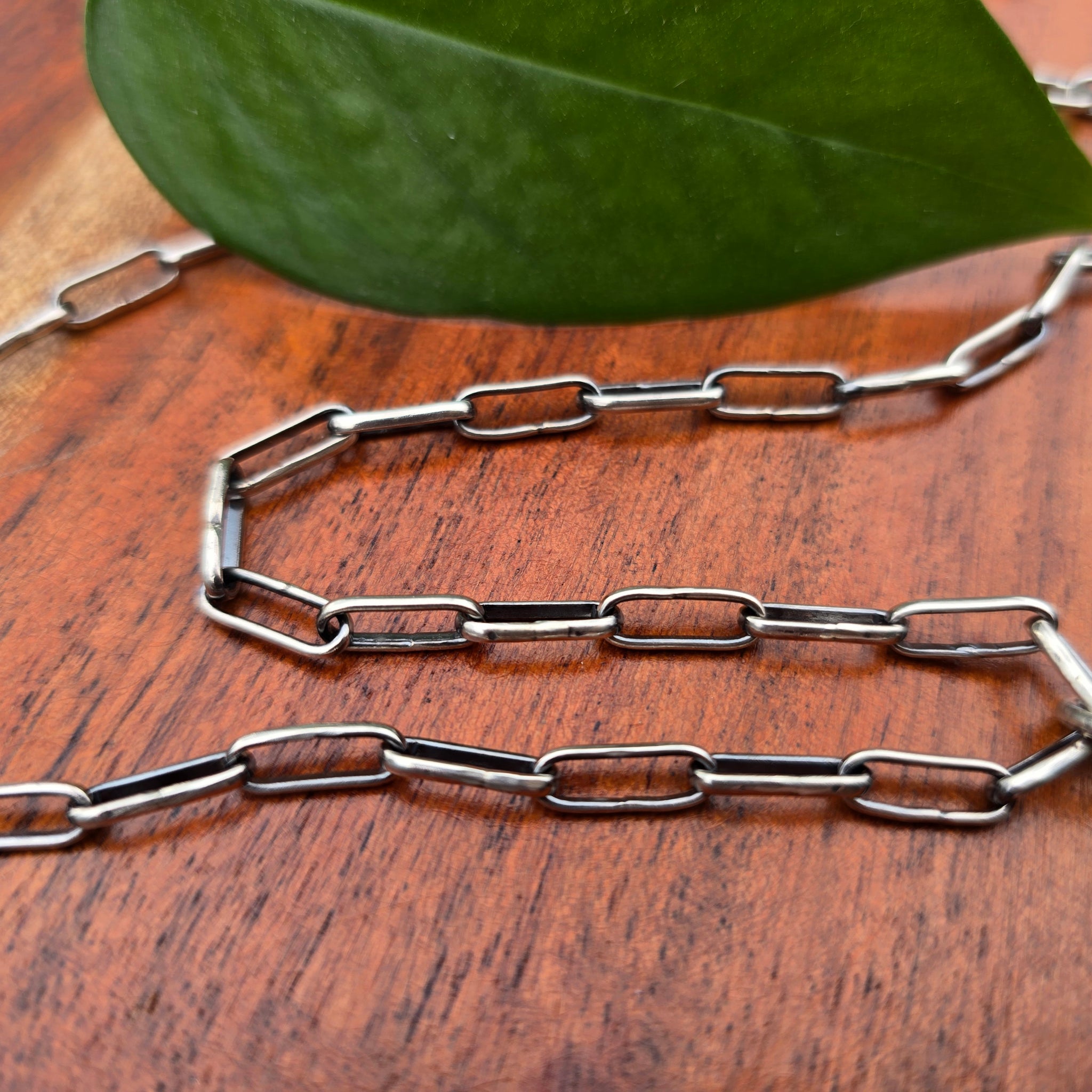 A stunning one-of-a-kind sterling silver Trillium Collection, hand-built with sculptural detail and intentional form. The necklace measures just under 20 inches, featuring substantial hand-forged links along the back and three meticulously shaped trillium flowers across the front. Their leaves splay outward, connecting into a flowing swirl motif that transitions seamlessly into the chain. Oxidized to reveal depth and texture, the piece carries a refined presence—anchored in the rugged beauty of the Adirondack wildflower that inspired it.