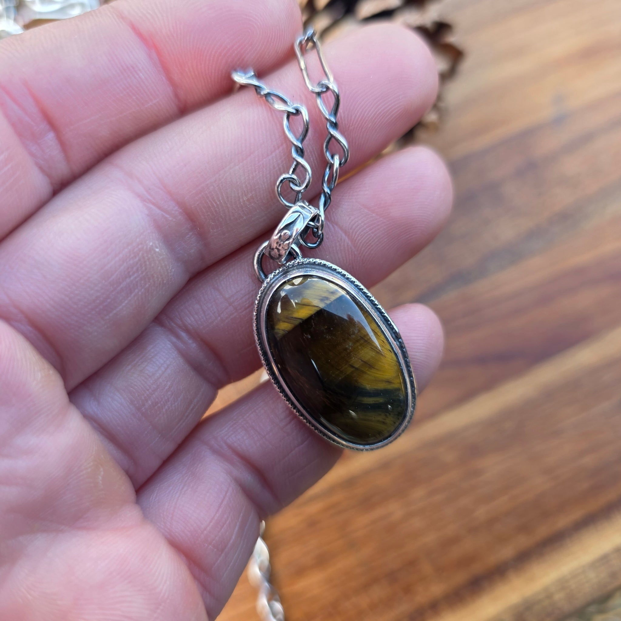 A Tiger Eye stone with pronounced golden banding anchors this pendant, selected for its depth and directional movement. Decorative wire defines the perimeter, applied with control to frame the stone without softening its edges. A flower-patterned bail was formed as an integrated structural element rather than an attachment, maintaining continuity between pendant and chain. The scale remains compact while preserving material thickness and clarity of detail.
