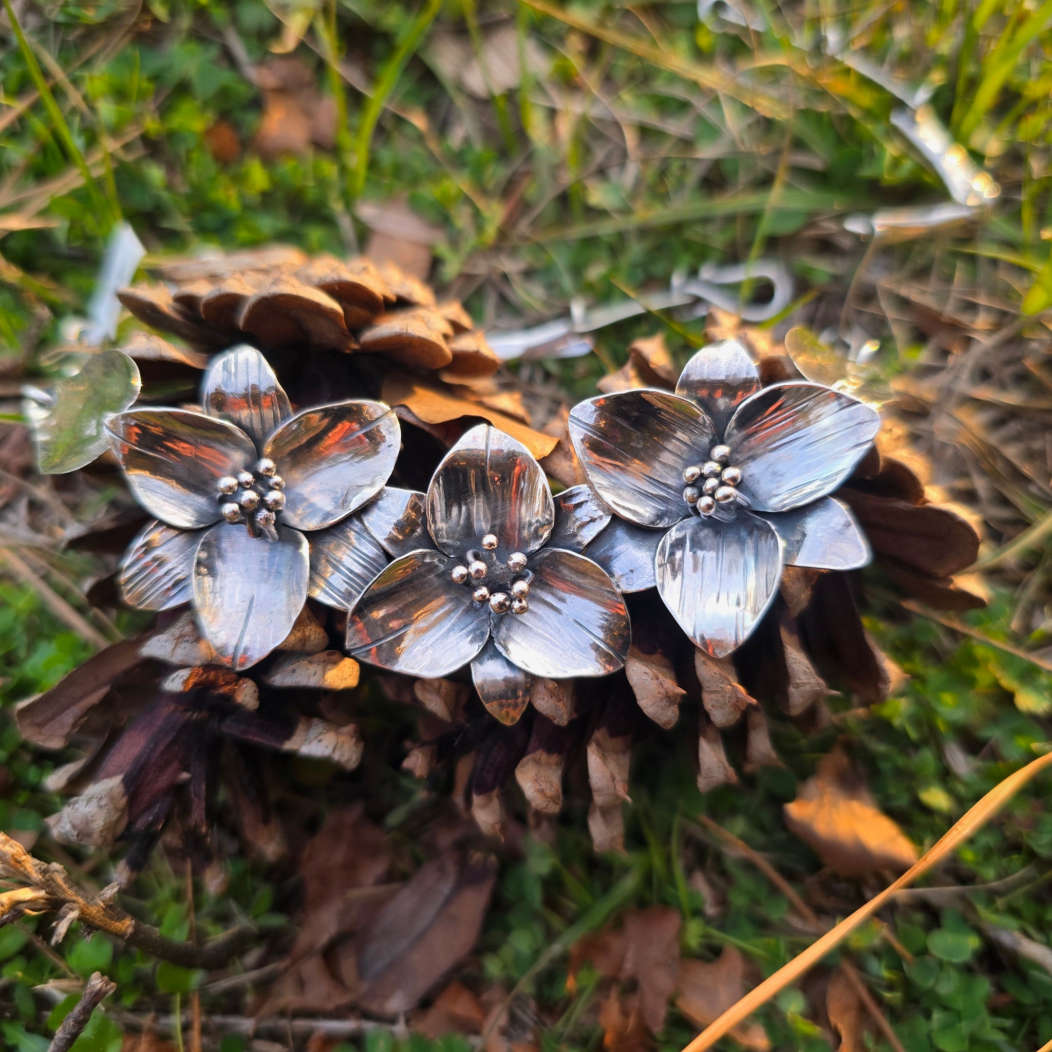 This necklace is built with substantial weight and a grounded presence, centered around a hand-forged trillium form. The proportions were determined to support the mass of the silver, allowing the piece to rest with stability across the collarbone. An oxidized finish was applied intentionally to deepen surface contrast and reinforce the dimensional structure of the form. The build favors permanence and restraint over decoration.