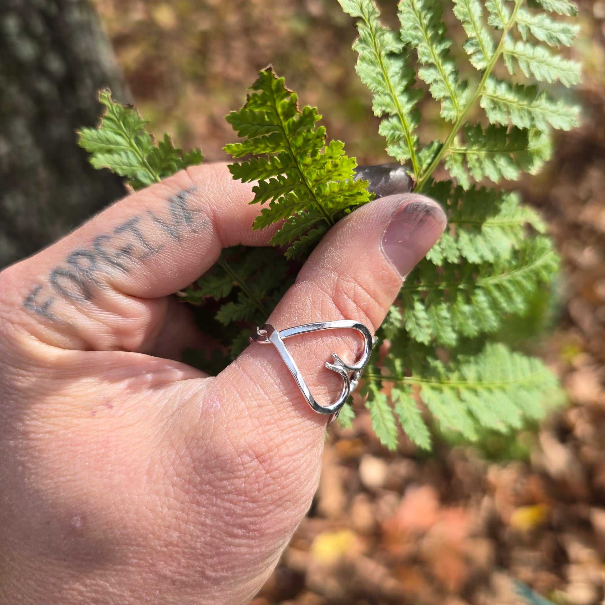This ring is formed from two heart elements twisted together into a continuous band. Built individually in sterling silver, the structure is unified rather than applied. Subtle surface variation reflects hand-forged construction while maintaining a controlled profile. The form is balanced and solid across the band.
